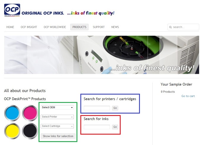 Выберете производителя принтера "Select OEM" > Выберете модель принтера "Select Printer" (и нажимаете "Show inks for selection", если хотите посмотреть чернила для всех картриджей) > Выберете картридж "Select Cartridge" (если хотите посмотреть чернила для определенного картриджа) > Нажимаете "Show inks for selection"