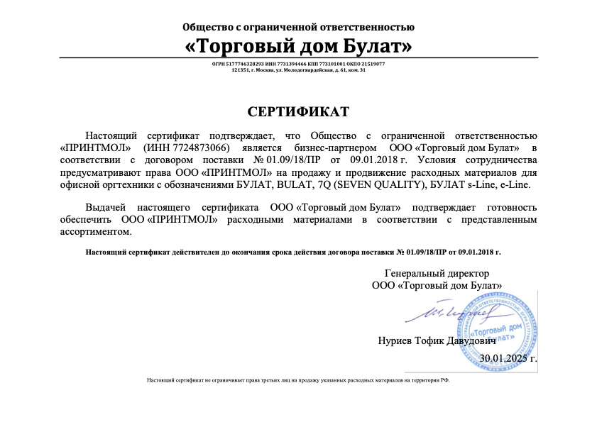 Наш интернет-магазин является официальным дистрибьютором в РФ высококачественных расходных материалов и картриджей для принтеров и МФУ под популярными торговыми марками: БУЛАТ, BULAT, БУЛАТ s-Line и БУЛАТ e-Line.